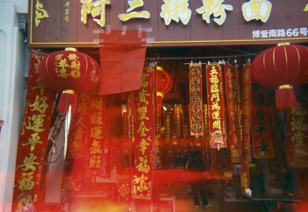 这里有很多骑楼——一种独特的岭南地区建筑,虽然老旧却留下了历史的烙印与痕迹。“胡生记”等一众老字号没有再开,牌匾连同后来的宏大标语仍然刻在骑楼上。老街上年味儿很重,重到平时卖粥粉面的小店都停下原本的生意,挂满年货,全心全意叫卖对联、灯笼等一切春节用物。