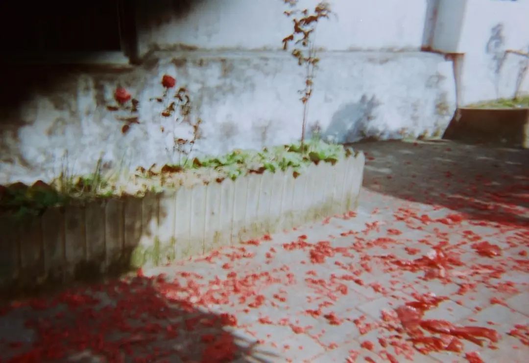 最终的照片排列,前面是火热的阳光和烛火,最后是一地的鞭炮屑和紧闭的门窗。老人家的生活,年前有多热烈,年后就有多落寞。印象最深的就是鞭炮纸屑这张,因为一次性相机的故障和强烈的阳光,最后呈现出来的效果,就像刚做完一个盛大的梦之后的一地鸡毛。