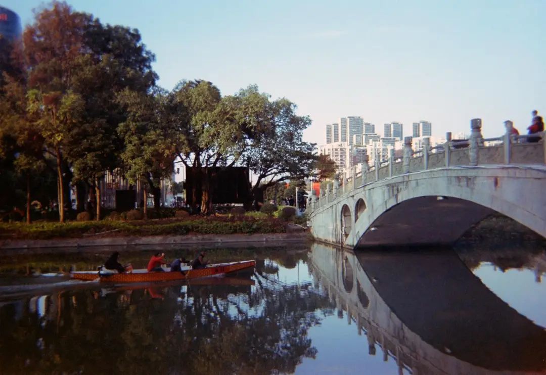 但也有很多故事是远离了喧嚣,别有一番滋味。例如节前河中训练的龙舟、中午桥底空荡的篮球场运动的父子、健身步道上骑车的一家人、草坪上晒太阳的母子和爷孙,不同的场景,同样的悠闲和幸福。