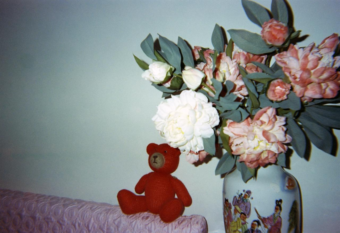 这个印有八仙过海图案的花瓶在我很小的时候就是家里的一员,如今插着妈妈去年买回的年代感假花,被姥姥、姥爷当做真花一样悉心呵护着。另一边,大姨做的小熊干干净净地放在沙发上。物件上,流动着淡淡的爱意。