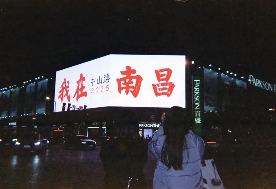 去年南昌老城商圈也为了顺应潮流,悄然多了几块巨型电子大屏,轮番滚动播放着一些有趣的画面和广告。那天偶然抬头,屏幕上正显示着“我在中山路南昌2025”的字样,来不及拿起相机,便在原地耐心等待下一轮播放。