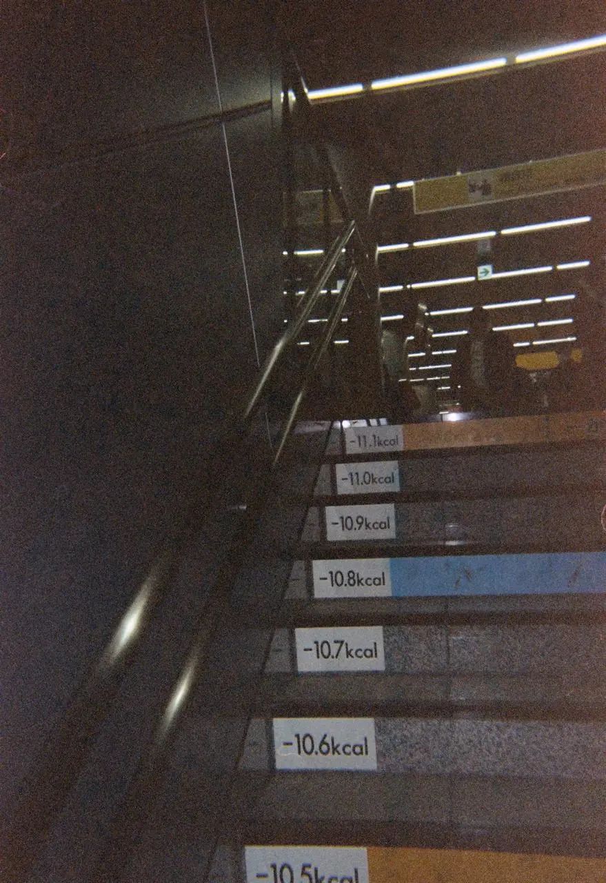 吃饱喝足出来,又被地铁台阶上的标识“哄”到了——每迈一节台阶减0.1千卡热量,一口气爬上去立减11.1千卡哦!