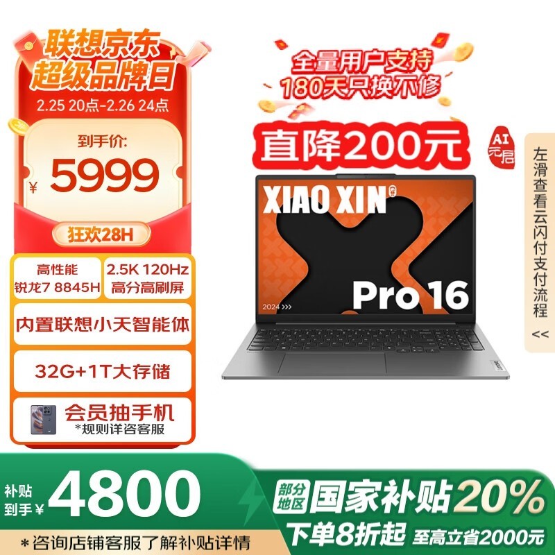 联想小新Pro16AI轻薄本AMD32G内存1TB仅4767元
