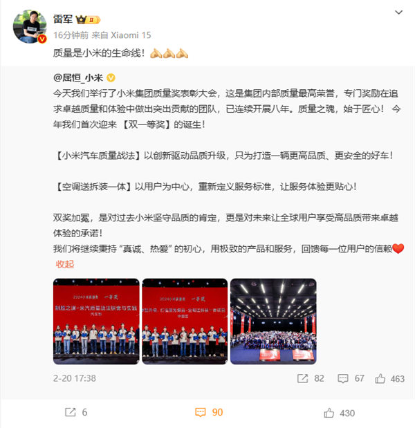 快科技2月22日消息,前两天,小米举行了质量奖表彰大会,这是集团内部质量最高荣誉,专门奖励在追求卓越质量和体验中做出突出贡献的团队。