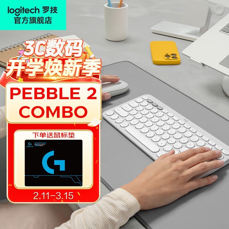 罗技PEBBLE 2 COMBO无线静音键鼠套装月凝白学生办公必备