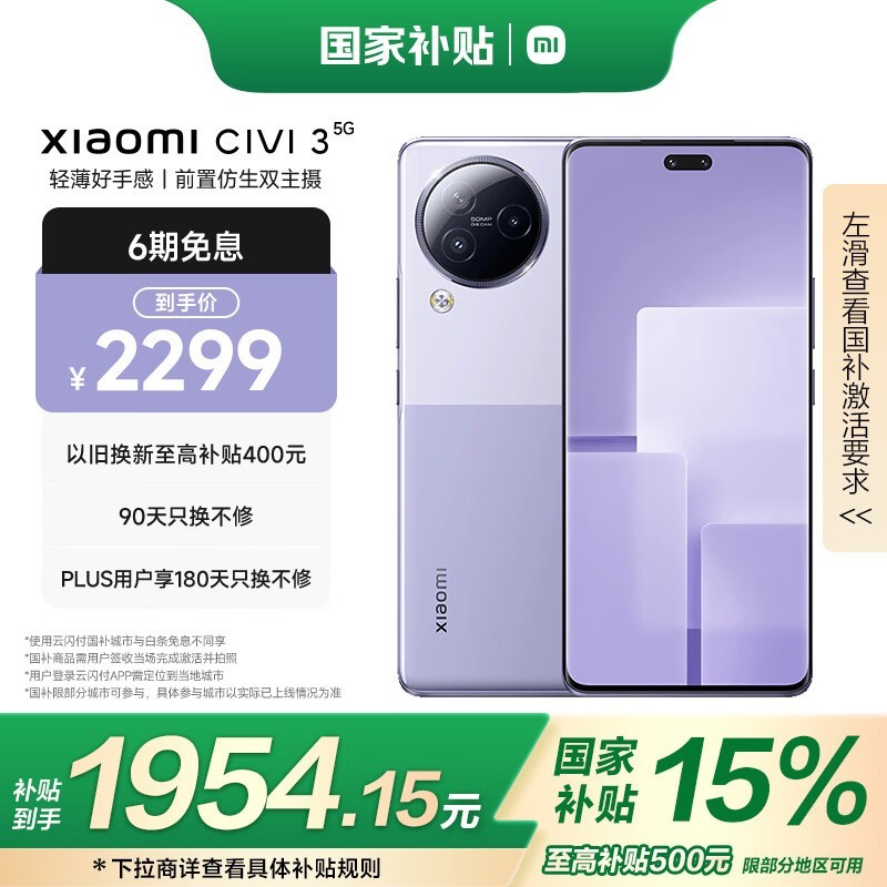 小米Civi 3 5G手机京东国补15%优惠仅1944元