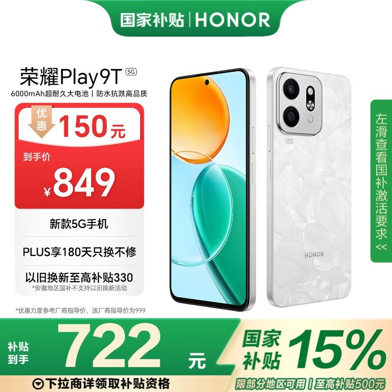 荣耀HONOR Play9T 5G手机月影白超值促销到手仅667元
