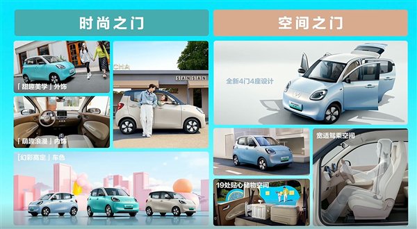 宏光MINI EV四门版延续了圆润、可爱的外观风格,配备“菱之翼”LED灯组,提供膨膨蓝、泡泡绿、甜甜咖三种车身颜色,而黑顶的双色车身,又为整车增添不少运动感。