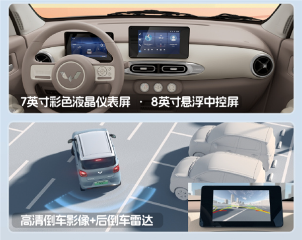 车辆内饰方面,四座版的智能和舒适性配置大增,车辆配备8英寸悬浮式中控屏、7英寸彩色液晶仪表屏,支持蓝牙电话、音乐播放、倒车影像、后倒车雷达等使用功能。