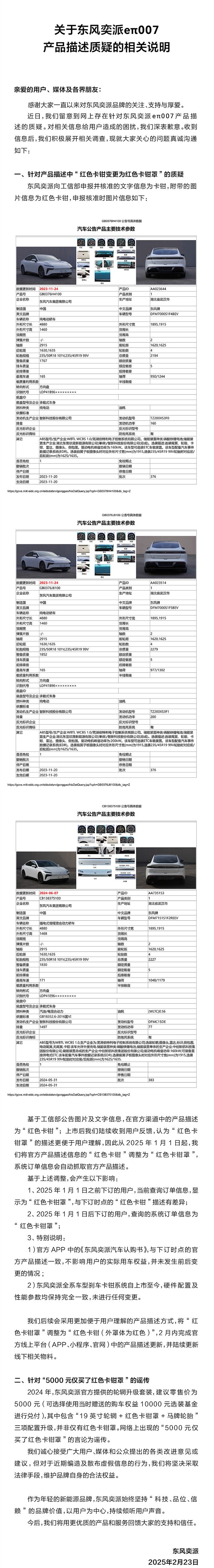 针对“红色卡钳变更为红色卡钳罩”的质疑,东风奕派向工信部申报并核准的文字信息为卡钳,附带图片信息为红色卡钳。