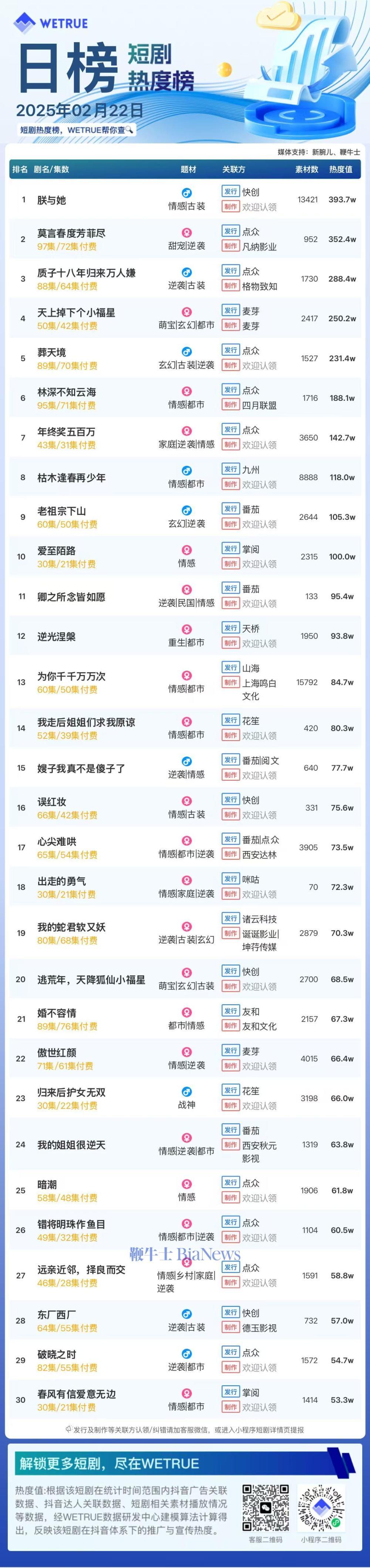 编者按:为帮助短剧从业者提供更多信息,专注于短剧报道的新腕儿和科技媒体鞭牛士联合WETRUE短剧热度榜共同推出短剧热度榜。