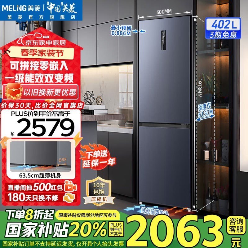 美菱402L风冷双门冰箱仅2479元包邮(原价2799)