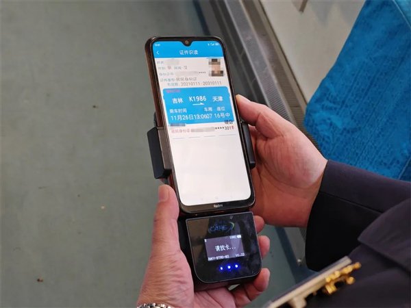 乘务员用终端机扫描旅客身份证,就可以快速核验车票信息。