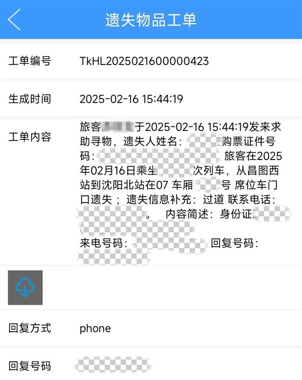 乘务员通过终端机接到遗失品工单,可快速匹配车厢和座位,到丢失地点寻找,找到后根据旅客留下的联系方式,第一时间将物品返还。