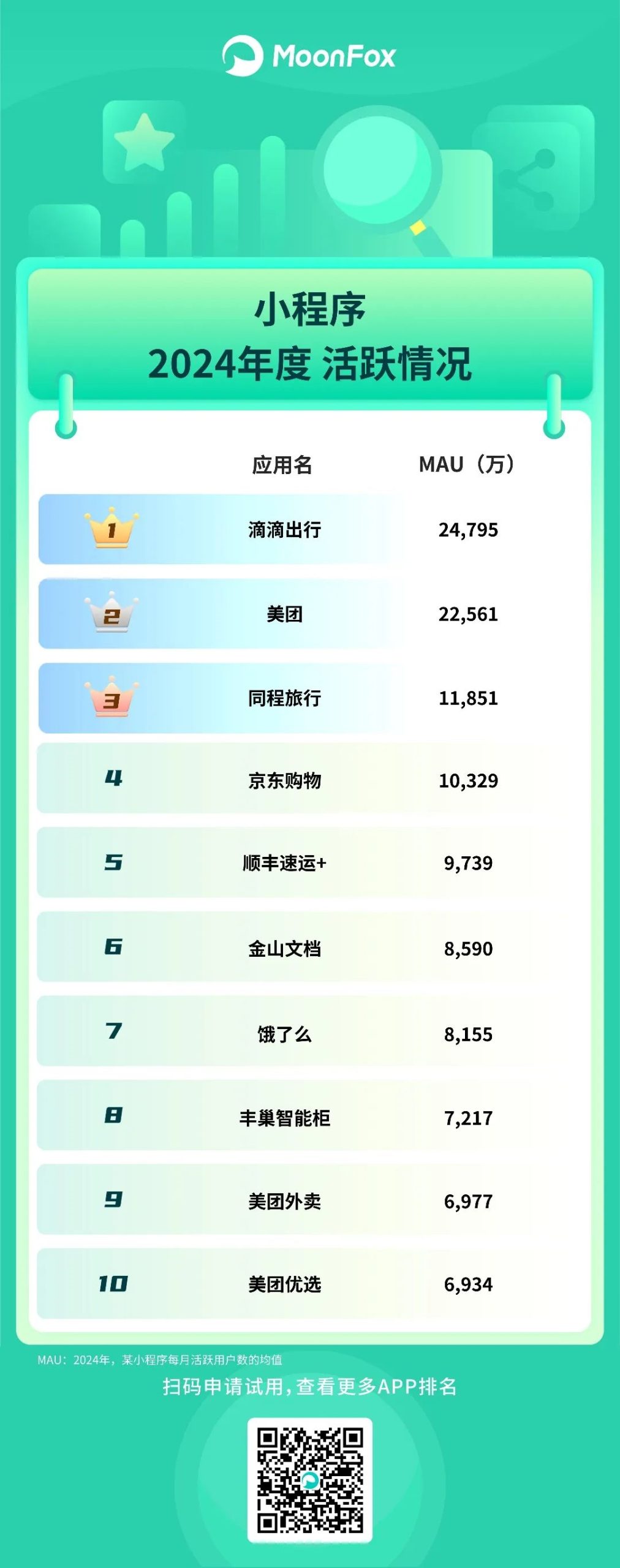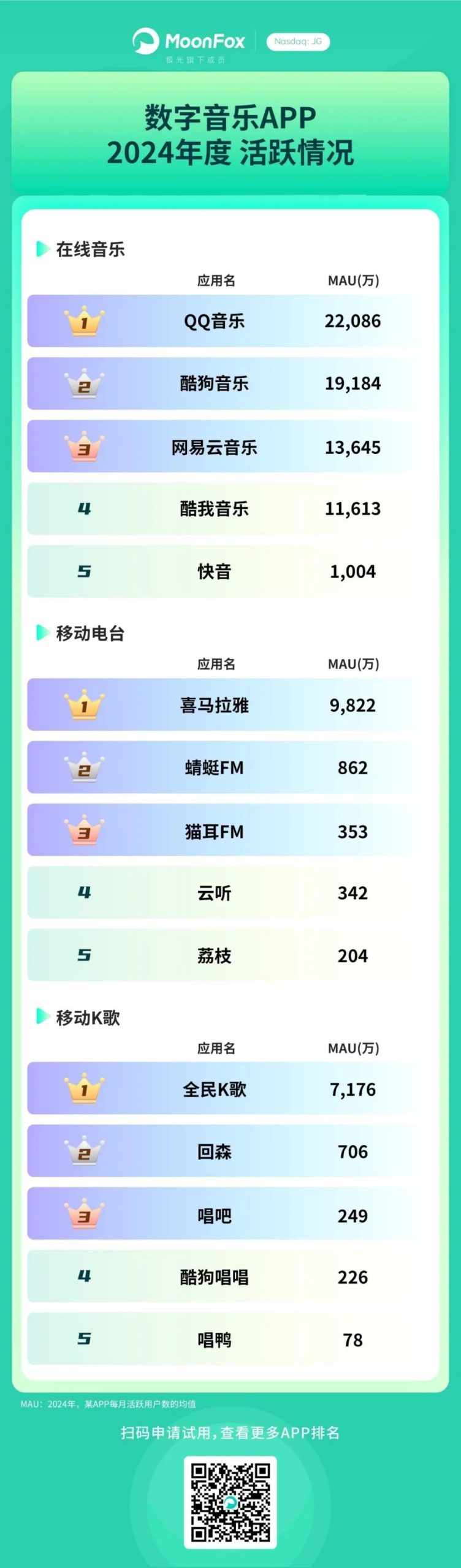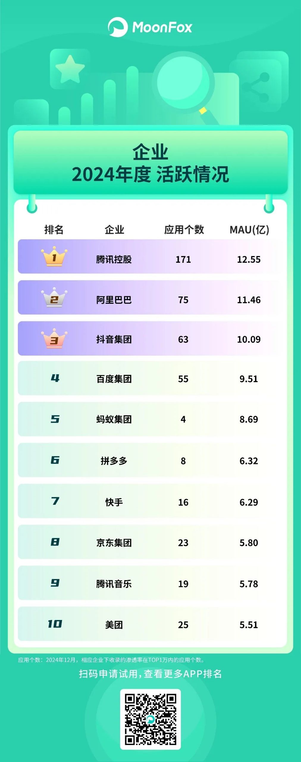 月狐数据公布了2024年度移动互联网App得活跃情况,基于MAU(月度活跃用户量)进行评选,分为多达15个子榜单。企业榜单上,腾讯以171个App、12.55亿用户占据榜首,如果加上第十名腾讯音乐系的19个App、5.78亿用户,合计超过18亿。