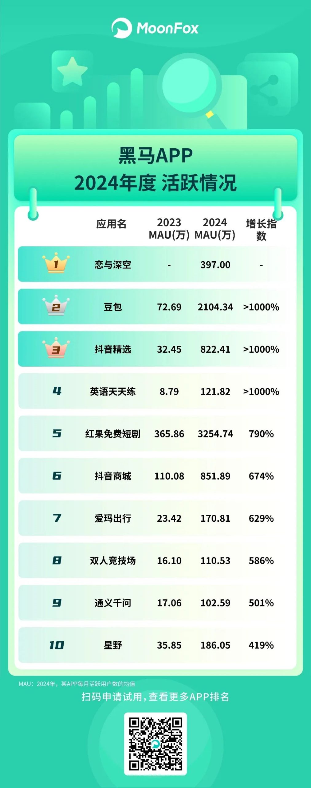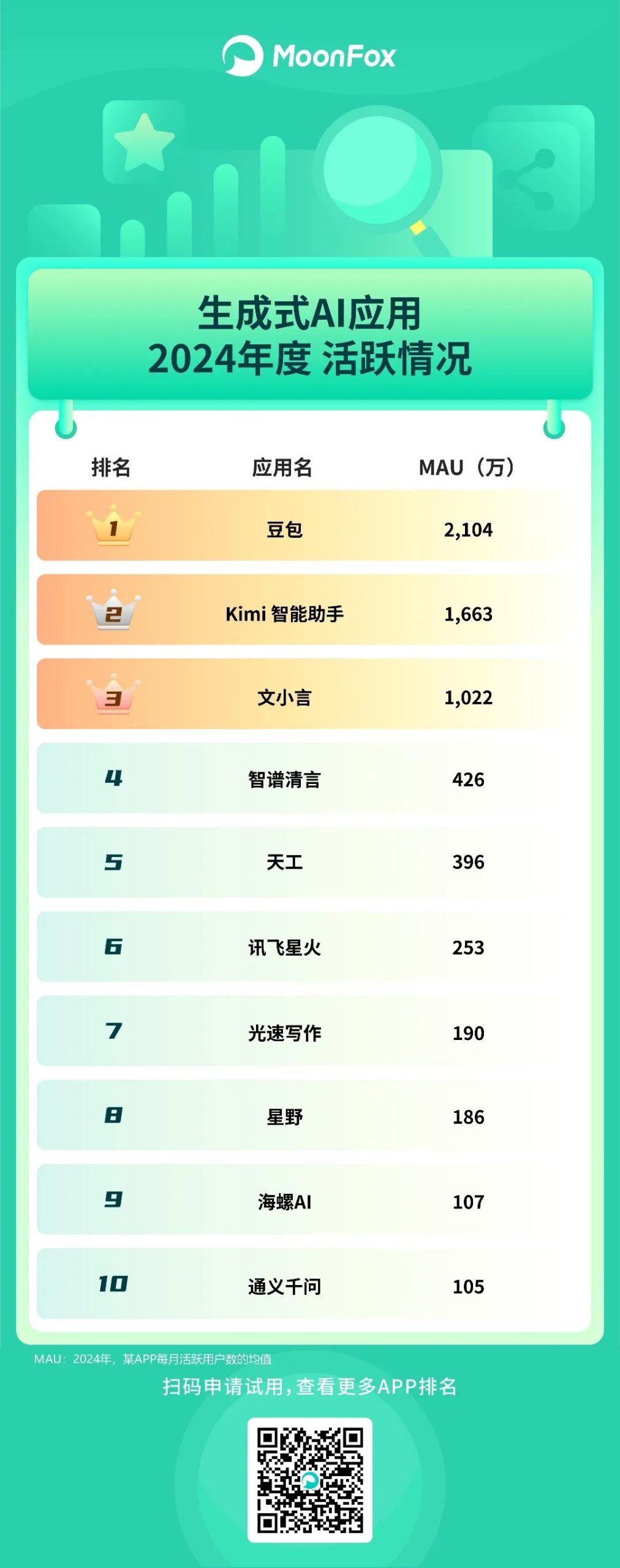 火爆的生成式AI应用中,豆包、Kimi、文小言高居前三甲,用户量分别2.10亿、1.67亿、1.02亿,其中豆包还是黑马App的第二名。
