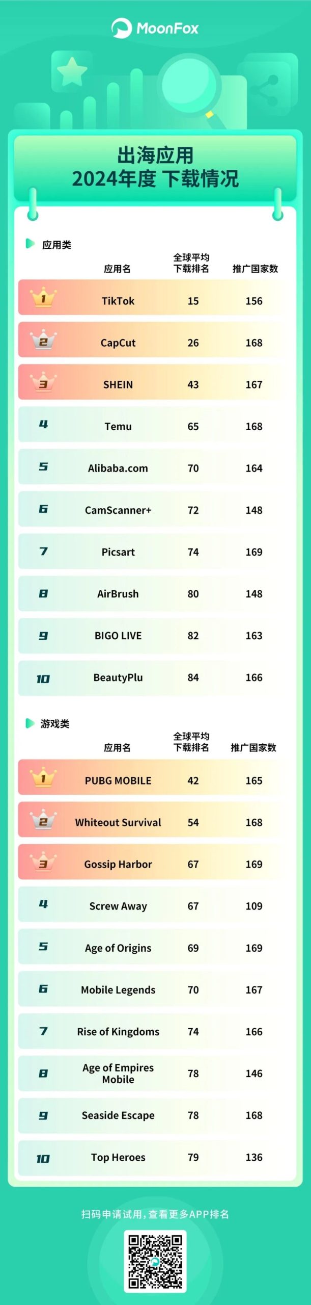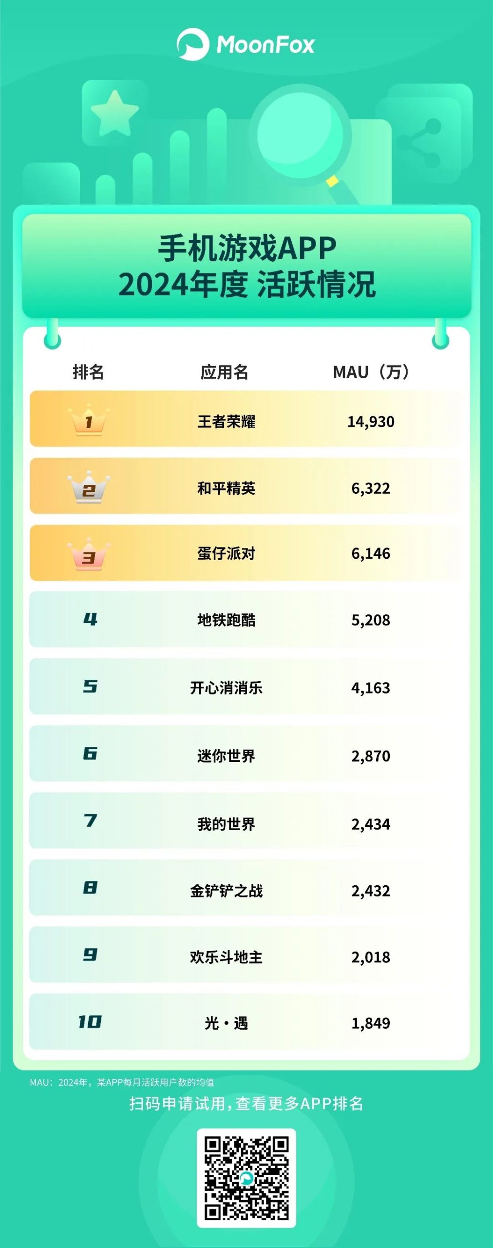 手游方面,王者荣耀、和平精英、蛋仔派对排前三毫无意外,地铁跑酷、开心消消乐也很抢手,欢乐斗地主排第九。
