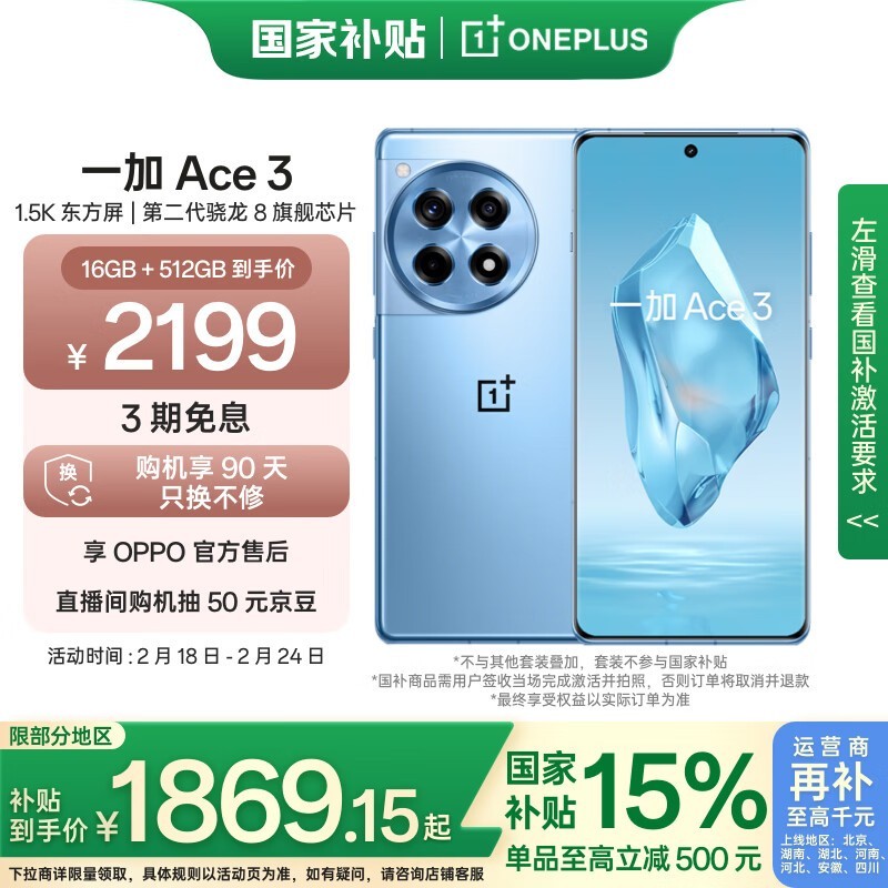 一加Ace3月海蓝5G手机16+512GB超大存储配置