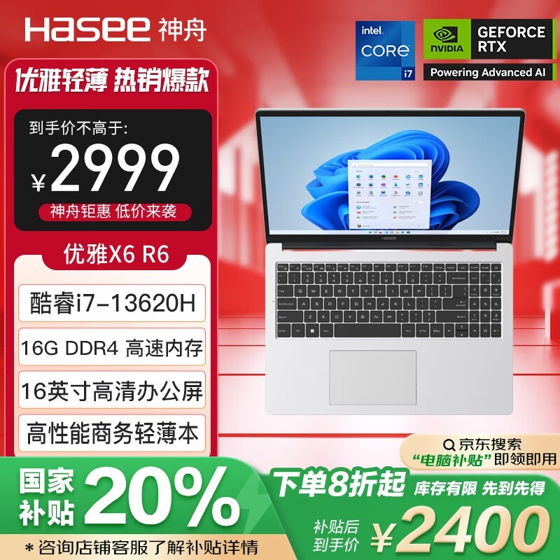 神舟优雅X6轻薄本16英寸13代i7-13620H京东到手价2400元