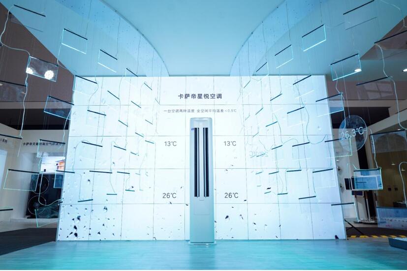一方面,卡萨帝星悦空调尊享版新品延续了致境空调AI双系统分控思路,加一路常温风,而且采用上下双路送风的设计,解决了空调冷风直吹的痛点,实现上下无温差。另一方面,常温风托举冷风送得更远,冷风下沉混合常温风形成舒适区,解决了远近冷热风感不同的痛点,实现远近无风差。目前,卡萨帝空调是行业唯一达到“1台空调,2种温度”效果的产品。