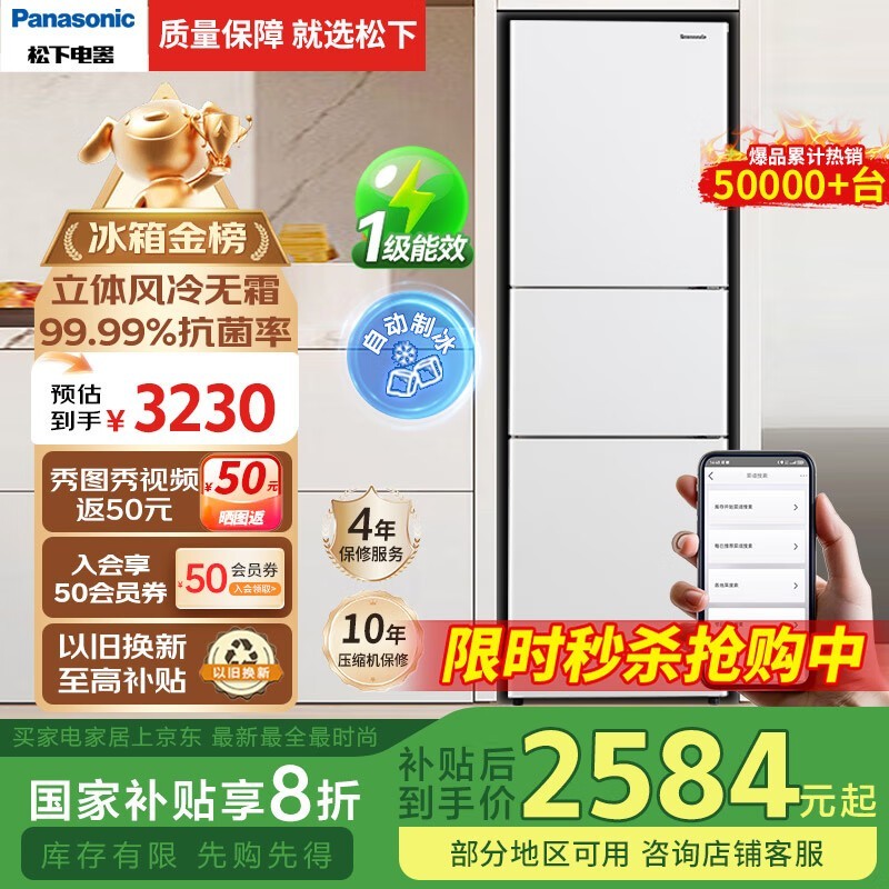 松下303L风冷三门冰箱NR-JS30AX1-W促销到手2423元