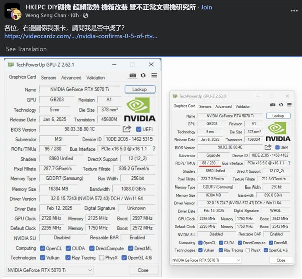 来自国外网友“The Zeitgeist”,使用新版GPU-Z 2.63版本检测了他刚刚入手的RTX 5070 Ti,确认ROP单元只有88个,而非正常的96个。