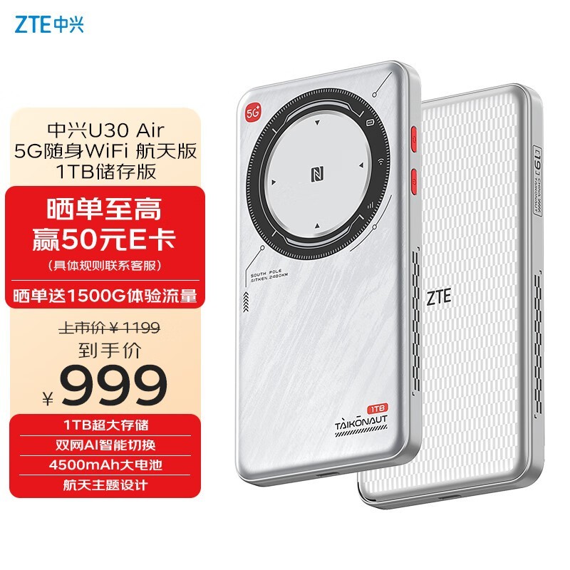 中兴5G随身WiFi U30 Air航天版+1T存储版京东特惠963元