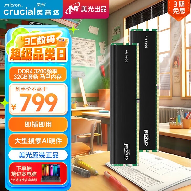 全新Crucial Pro系列DDR4 3200MHz 64GB台式机内存促销仅799元