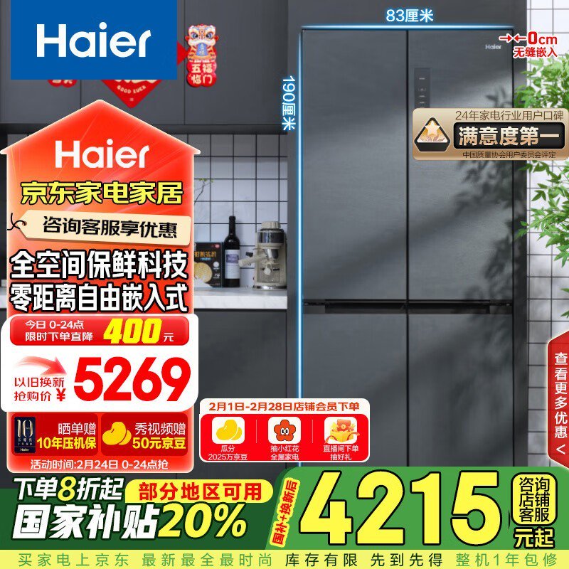 海尔505L风冷十字对开门冰箱仅4056元