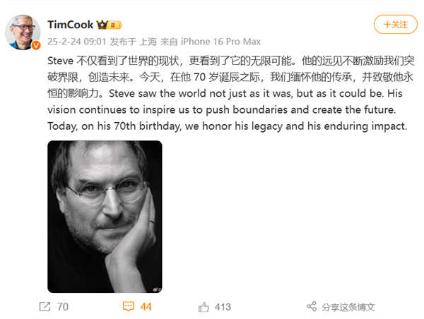 库克博文这样写道:Steve 不仅看到了世界的现状,更看到了它的无限可能。他的远见不断激励我们突破界限,创造未来。今天,在他 70 岁诞辰之际,我们缅怀他的传承,并致敬他永恒的影响力。