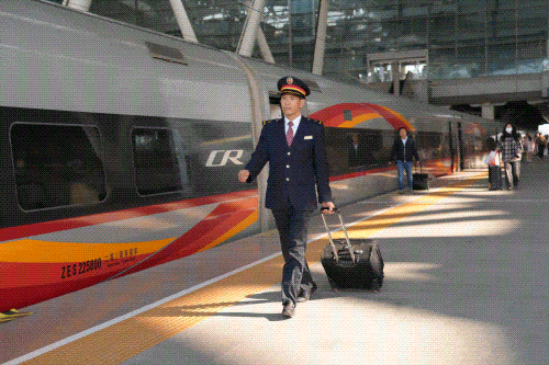 当天,广州机务段广州南高铁运用车间组织人员在站台举办了接车仪式,大家为倪伟平披上绶带。