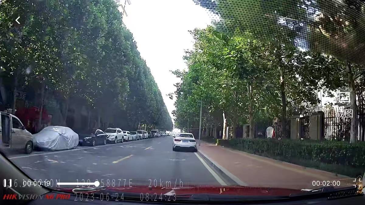 白天,超大广角镜头可以完整拍摄到车辆前方的道路情况,画面边缘没有明显的畸变。WDR技术使得在强光和阴影并存的场景下,也能清晰展现亮部和暗部的细节。夜晚,画面的清晰度和噪点控制都还可以,能够满足夜间行车记录的需求,但落到比如车牌号这些细节当中就没那么清晰了。