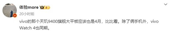 近日,有数码博主爆料称,vivo那款天玑9400旗舰大尺寸平板应该是4月发布。除了两款手机外,vivo Watch 4手表也会在同期亮相。这里的“天玑9400旗舰大尺寸平板”应该就是vivo Pad 4 Pro,“两款手机”就是前文提到的vivo X200 Ultra和vivo X200s,vivo Watch 4手表目前还没有太多确切消息。