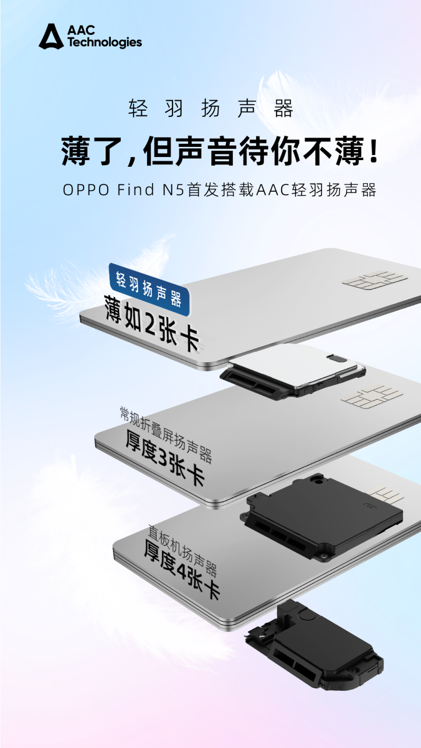 据瑞声科技官方消息,OPPO Find N5在声学和触感方面,分别搭载了瑞声科技“轻羽扬声器”、和折叠机专用马达AeroEngine,开创了行业先河。