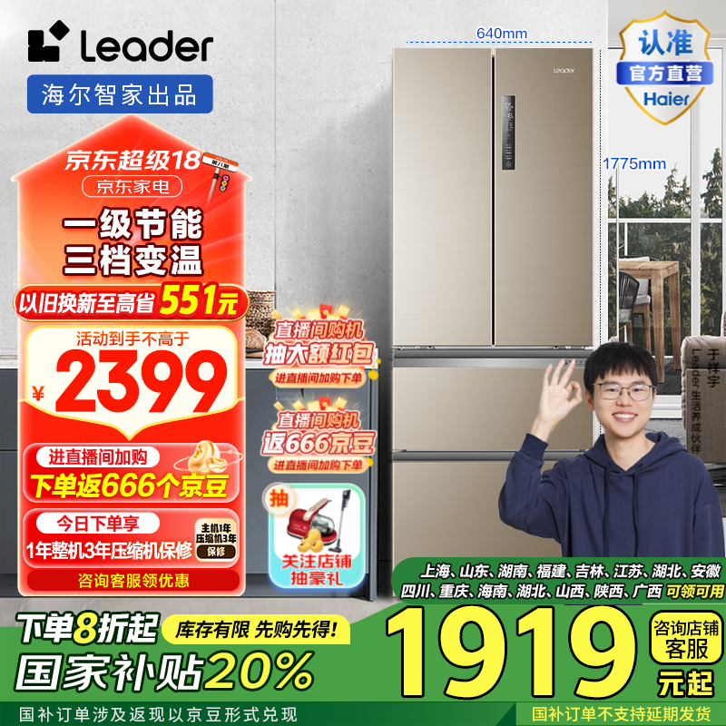 Leader多门冰箱335L风冷无霜静音杀菌保鲜2199元