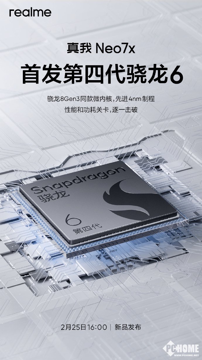 真我Neo7x将于2月25日16:00正式发布,全球首发第四代骁龙6,骁龙8Gen3同款微内核架构,先进4nm制程加持,或将带来强悍的性能。