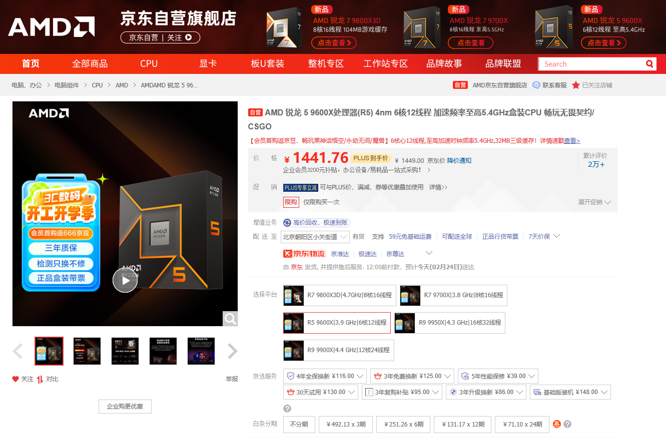 目前AMD 锐龙5 9600X处理器在京东自营旗舰店的最新报价是1449元,京东PLUS会员到手更加优惠。朋友们在购买之后还可以参与晒单抽周边壕礼的活动(指定型号前往页面查看),成为京东旗舰店会员还有首购返666京豆和积分抽大奖活动。目前AMD 锐龙5 9600X处理器的报价属于限时低价,对于学生玩家来说可以省下更多的预算,真的非常合适,建议同学们赶快入手。