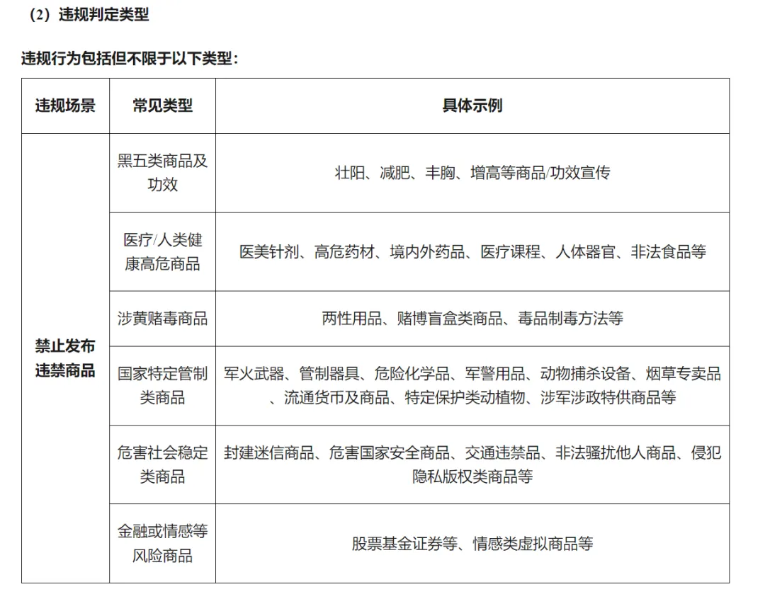 在商品推广方面,新规对禁止推广的违规商品进行了详细规定。其中,违禁商品被严格禁止,包括 “黑五类” 商品及功效宣传,如壮阳、减肥等;医疗人类健康高危商品,如医美针剂、高危药材等;涉黄赌毒商品;国家特定管制商品,如军火武器、管制器具等;危害社会稳定商品;金融或情感等风险商品。