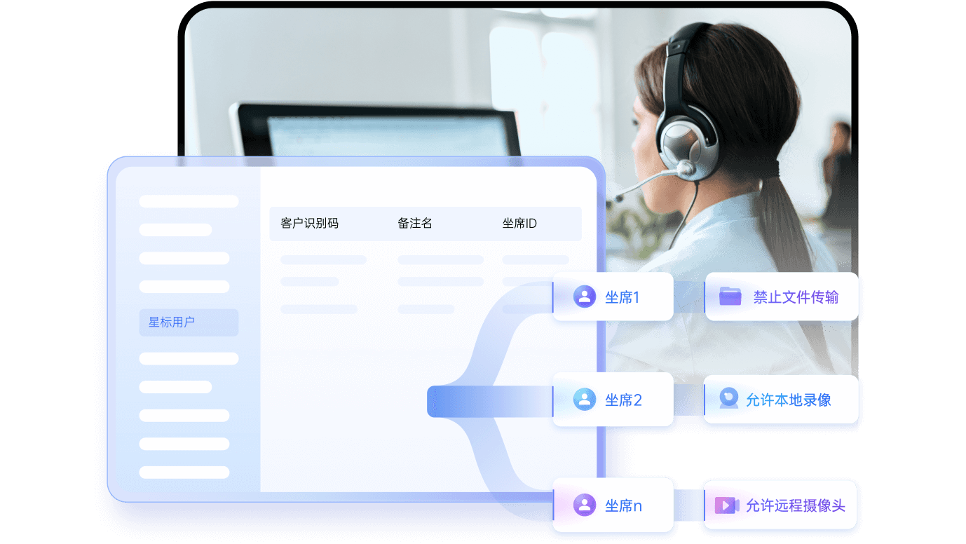 对于一线坐席的远程控制权限,企业可以进行统一的精细化授权,为不同客服组的坐席按照业务需求设置不同的远控权限,比如是否允许传输文件、是否允许本地录像、是否允许远程摄像头等等。
