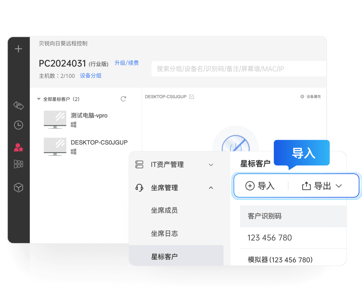 产品交互设计方面,向日葵技术支持解决方案采用识别码快速访问模式,一线客服人员可将客户的远控识别码星标备注并存入列表,支持多达300个识别码星标,以便后续服务时进行快速访问。