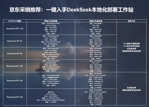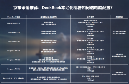 DeepSeek-R1目前已经发布了1.5b/7b/8b/14b/32b/70b/671b共7类不同参数量的大模型版本,小至10亿参数,大至6710亿参数,适配自然语言处理、内容生成创作、数据分析与决策支持、教育培训、多元场景和垂直领域专业化任务等不同的场景需求和功能,相对应的也需要不同级别的硬件性能配置, 参数越大所需的计算资源就越大。为了让用户能迅速找到匹配自身需求的机型,京东采销针对适配各版本模型的电脑、服务器进行了分类配置和产品推荐,用户可根据预算和需求进行选择。