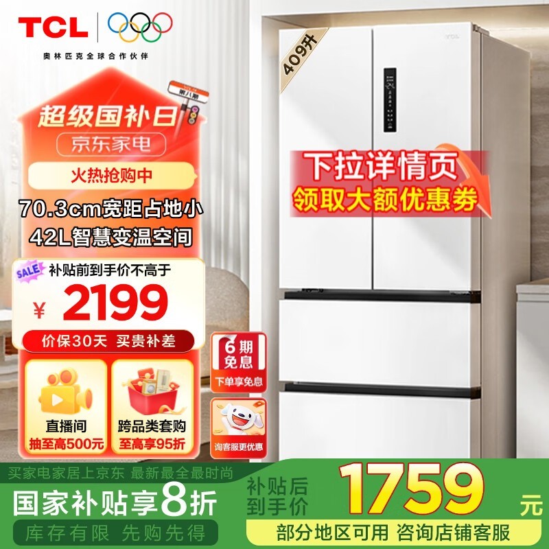 TCL409升四开门冰箱R409V5-D高效节能智能科技