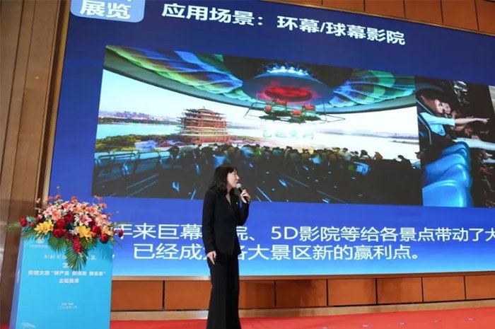 活动现场,近 20 家文旅领域优秀企业带来了精彩的 “三新” 主题路演。通过视频展示、现场推介、产品体验等丰富形式,将近年来文旅产业融合创新的成就一一呈现。其中,合肥全色光显科技有限公司打造的 “合肥市骆岗公园南入口光影秀” 成功入选 “新场景典型案例”,成为全场焦点之一。 激光显示等声光电技术正逐步应用到文旅产业,从沉浸式光影艺术展示,到大型实景演艺的应用,科技不断创造出新奇且极具吸引力的文旅体验,成为推动文旅产业升级的关键力量。