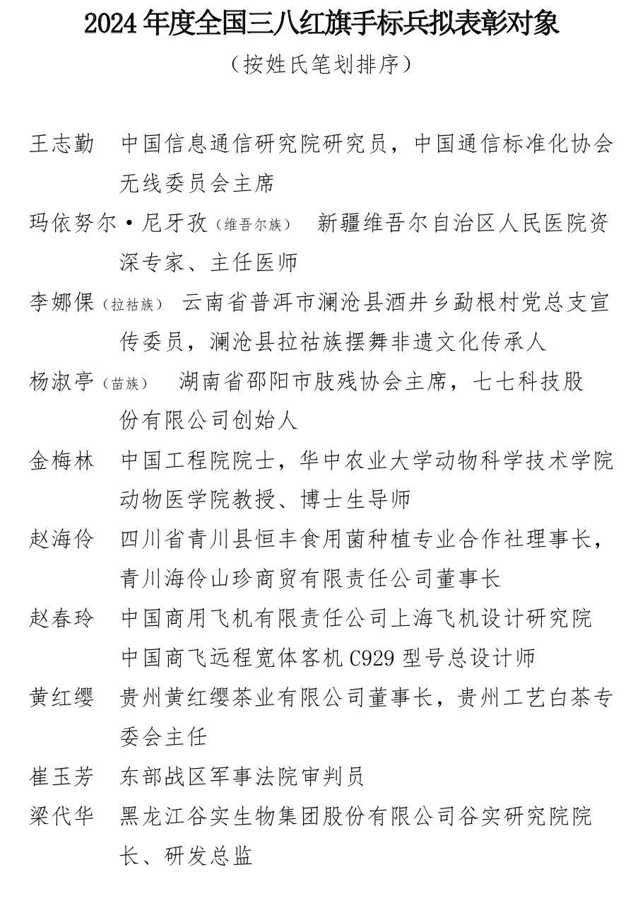 2月20日,中国妇女网发布公示,拟表彰10位全国三八红旗手标兵、600位全国三八红旗手、396个全国三八红旗集体、600个全国巾帼文明岗。其中,中国信息通信研究院王志勤位列全国三八红旗标兵公示名单。公示期为2025年2月20日至2月26日。