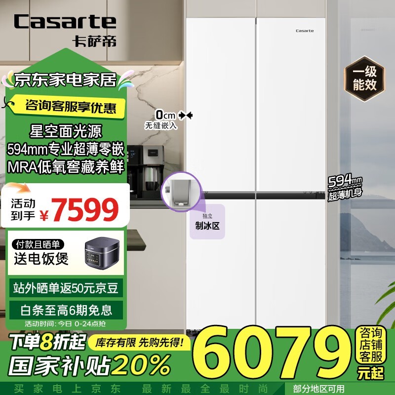卡萨帝星空系列冰箱477升超薄零嵌十字门5444元到手