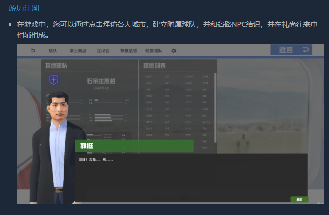和FM一样,需要玩家为球队布置战术但在这款“国足模拟器”里,玩家要考虑的内容还包括了青训规划、设施建设、足协提案、上下级关系,以及“江湖”: