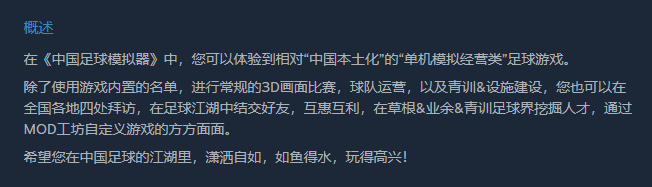 悟空的游戏叫作《中国足球模拟器》(以下简称“国足模拟器”),从Steam的游戏介绍上,你也能看出这款游戏的奇异之处: