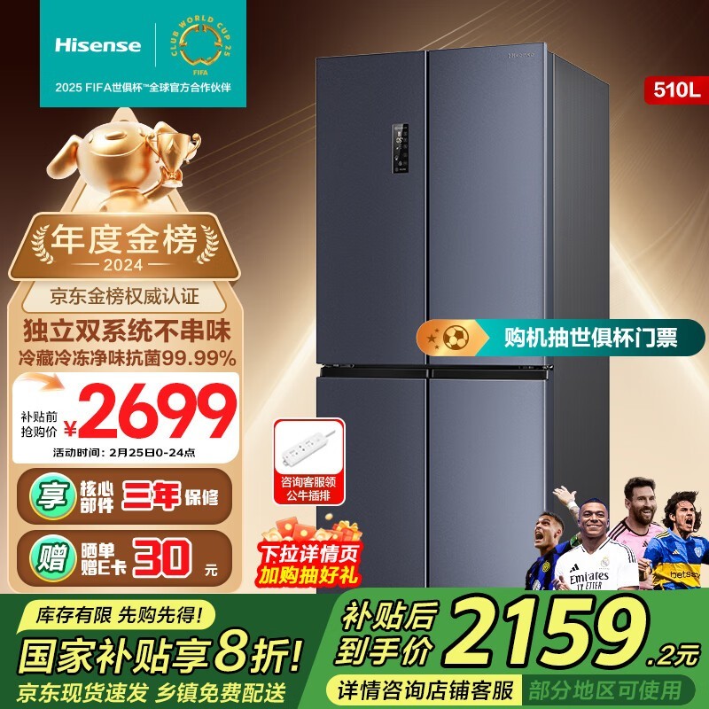 海信Hisense食神系列510L十字对开门冰箱仅1991元