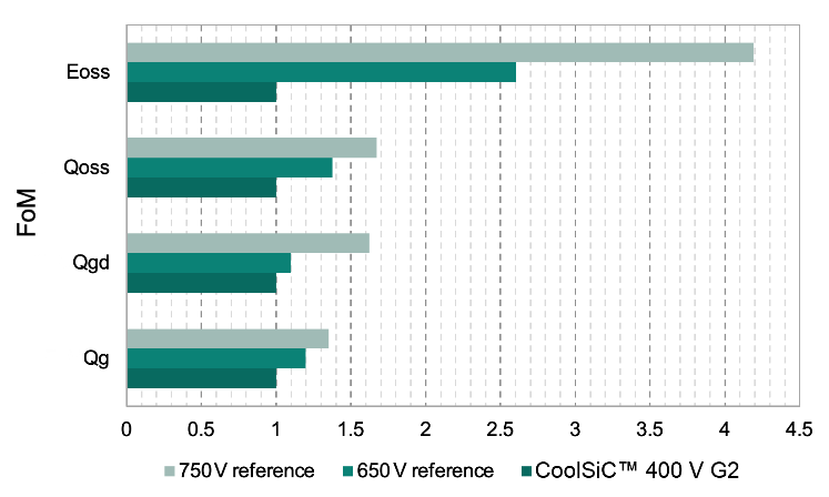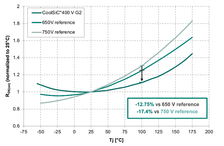 图5 400 V CoolSiCTM与650 V和750 V CoolSiCTM对比,具有更优的开关 FoM和稳定的RDS(on)与结温的关系:品质因数(上),RDS(on)与Tj(下)