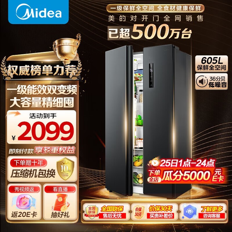 美的605升对开门冰箱双变频一级能效大容量节能静音抗菌